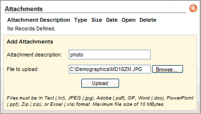 Pre-condition: You will need a photo of an employee that is a square and less than 500 pixels by 500 pixels. The photo can be a BMP, GIF, JPEG, or PNG. Most digital cameras and camera-phones take rectangular pictures that will need to be edited in an art or photography program before the photos can be used on the demographics tab. A photo that is close to a square, with a maximum deviation of 0.1, is accepted as a demographics photo. Photos that don't meet these specifications can be uploaded with a different description for access through the attachments window.