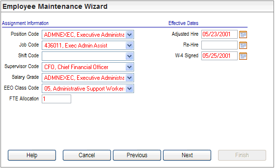 The Primary Employee Position Detail is updated with any new Job and/or Position information entered through the Employee Maintenance Wizard.